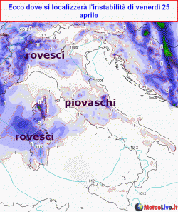 Acquazzoni soprattutto su Lazio, Abruzzo, Sicilia, Molise, Campania e nord Puglia. Giovedì 24 generale miglioramento. Venerdì 25 un po' instabile su nord, Sardegna, centrali tirreniche, sabato 26 su gran parte del centro-sud e sull'estremo nord-est. Domenica 27 netto peggioramento al nord, poi anche al centro e sulla Campania con calo delle temperature. Lunedì 28 ancora instabile, martedì 29 migliora.