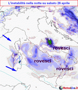 SABATO 26: tutta l’instabilità si porterà al centro-sud, coinvolgendo marginalmente anche l’estremo nord-est. Sono attesi rovesci e temporali sparsi, soprattutto su Campania,