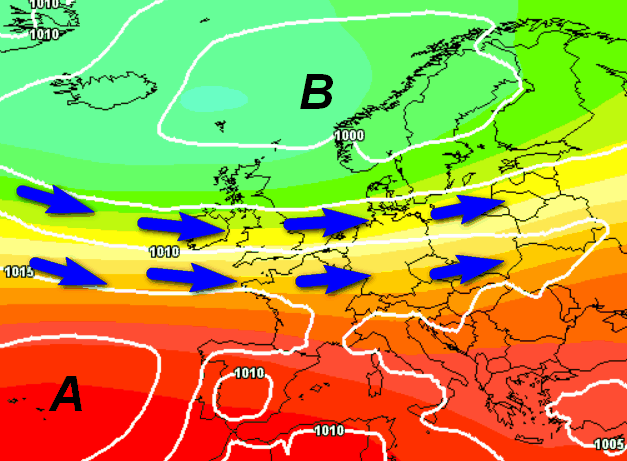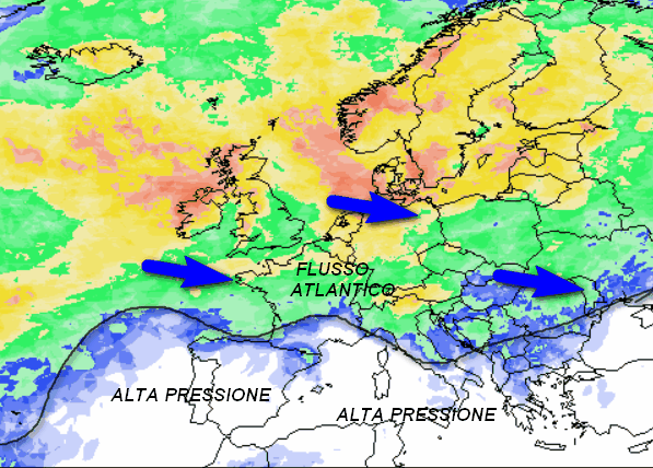La cartina mostra un flusso atlantico decisamente più energico soprattutto sull’Europa centro-settentrionale, ma con risvolti anche in Italia, specie sulle regioni settentrionali. L’alta pressione africana dovrebbe un po’ sgonfiarsi permettendo l’ingresso di aria meno calda su parte del nostro Paese.