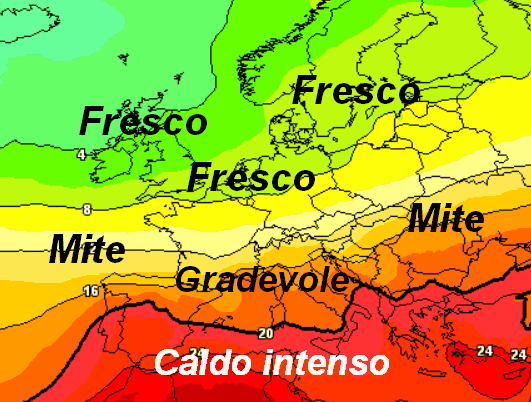 Un clima addirittura fresco sarà presente sulle Isole Britanniche e l’Europa settentrionale, mite invece sull’Europa centrale e la Francia, quasi gradevole sull’Italia settentrionale e centrale, con il caldo intenso marginalizzato tra la Sicilia e le estreme regioni meridionali.