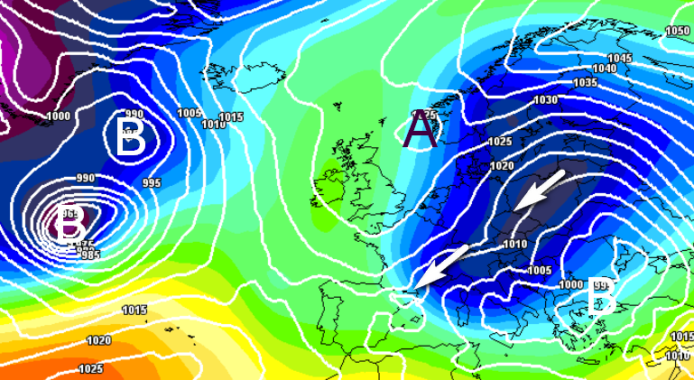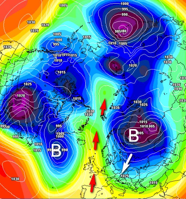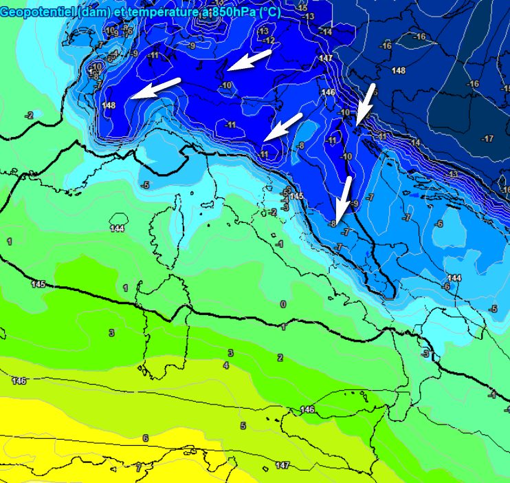 La parziale divisione del vortice polare in due rami, a causa dell’intrusione di aria mite di origine subtropicale sin sul Polo Nord, potrebbe determinare l’inserimento di aria gelida da nord-est sin sul nostro Paese, in particolare al nord e lungo le regioni adriatiche, come si nota qui per lunedì 17 febbraio dalle mappe termiche a 1500m del modello GFS: