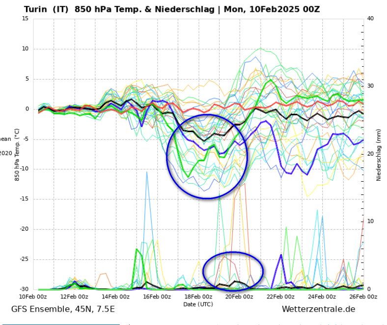 Ma con tutte queste premesse è invece possibile che le cose possano andare storte, cioè concludersi con un sostanziale nulla di fatto? Sembrerebbe di no, perché i famosi grafici “spaghetti” che riassumono il punto di vista di tutte le emissioni confermerebbero l’ondata di freddo da domenica 17, specie al nord, e segnalano anche il rischio di brevi nevicate sino in pianura, come vediamo in questo grafico riferito alla città di Torino. Notate quanti “spaghetti” puntino verso valori inferiori alla media del periodo a 1500m, segnale che l’irruzione fredda potrebbe davvero concretizzarsi:
