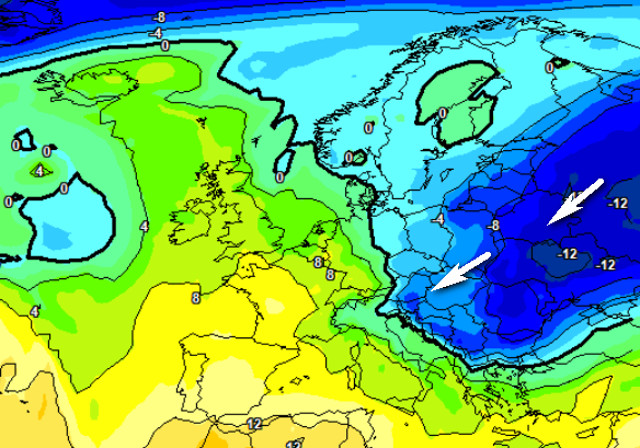 Il flusso freddo è ben visibile in rientro da est ed è testimoniato anche dalla disposizione delle isobare, che disegnano un naso sul catino padano, segnale di ventilazione orientale. Dunque tutta la Penisola sperimenterebbe un certo calo delle temperature, che però coinvolgerebbe in modo più marcato i versanti orientali e meridionali del Paese. Sull’est europeo si tratterebbe invece della prima ondata di freddo stagionale, come si può vedere da questa mappa termica a 1500m, notate le punte di -12°C tra Romania e Ucraina.