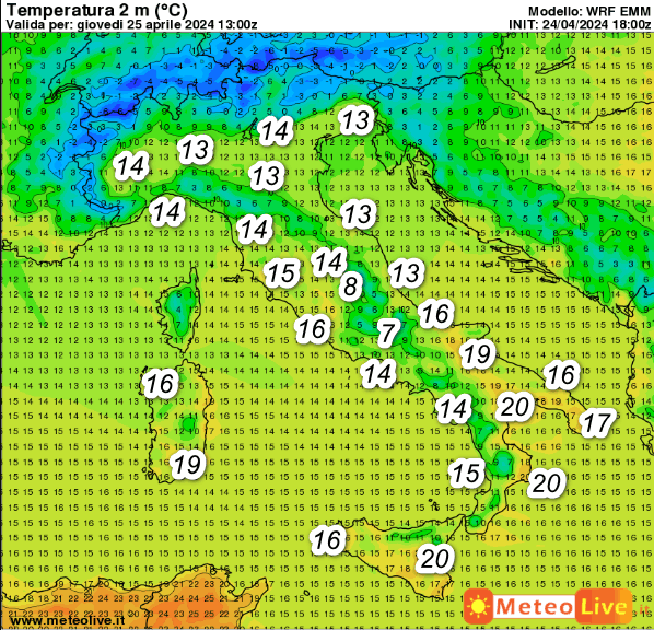 Valori ancora un po’ bassi al nord e al centro, più miti al sud e sulle Isole. Punte di 20° su Sicilia orientale, Calabria Ionica e Golfo di Taranto.