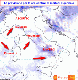 Cosa dovremo attenderci nella giornata odierna in Italia? La prima mappa mostra la situazione prevista per le ore centrali di oggi, martedi 8 gennaio.