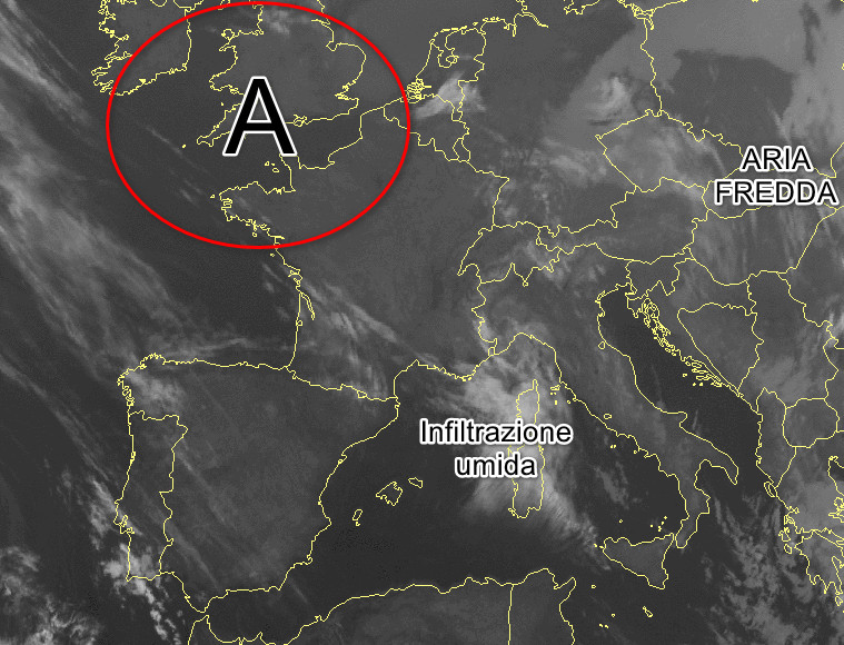 Il freddo si allontana verso levante e nello stesso tempo l’alta pressione che da giorni interessa il settore nord-occidentale del Continente si rinforza ulteriormente, portando un massimo abbastanza importante sulle Isole Britanniche. La figura stabilizzante si estende in parte alla nostra Penisola, dove sono però presenti infiltrazioni umide che non consentono una stabilità assoluta sul nostro Paese.