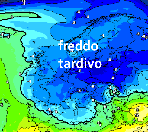 A livello termico il freddo vero e proprio potrebbe inserirsi sul nostro Paese alla fine dell’episodio, cioè intorno a metà marzo, come si vede da questa mappa termica a 1500m prevista proprio per quella giornata: