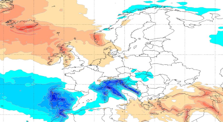 Laddove invece farà molto freddo le precipitazioni risulteranno complessivamente nella media e di tipo prevalentemente nevoso (parte della Scandinavia, est europeo ma soprattutto Russia). Da notare anche il deficit pluviometrico all’estremo sud del nostro Paese, perché con buona probabilità le depressioni agiranno un po’ più a nord.