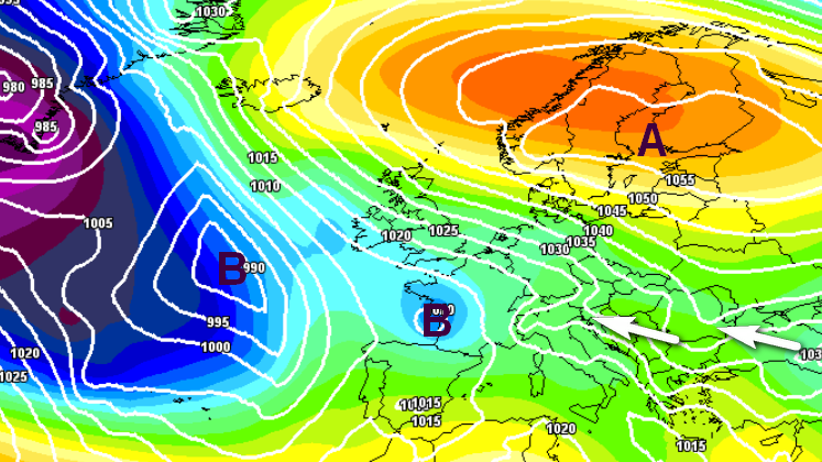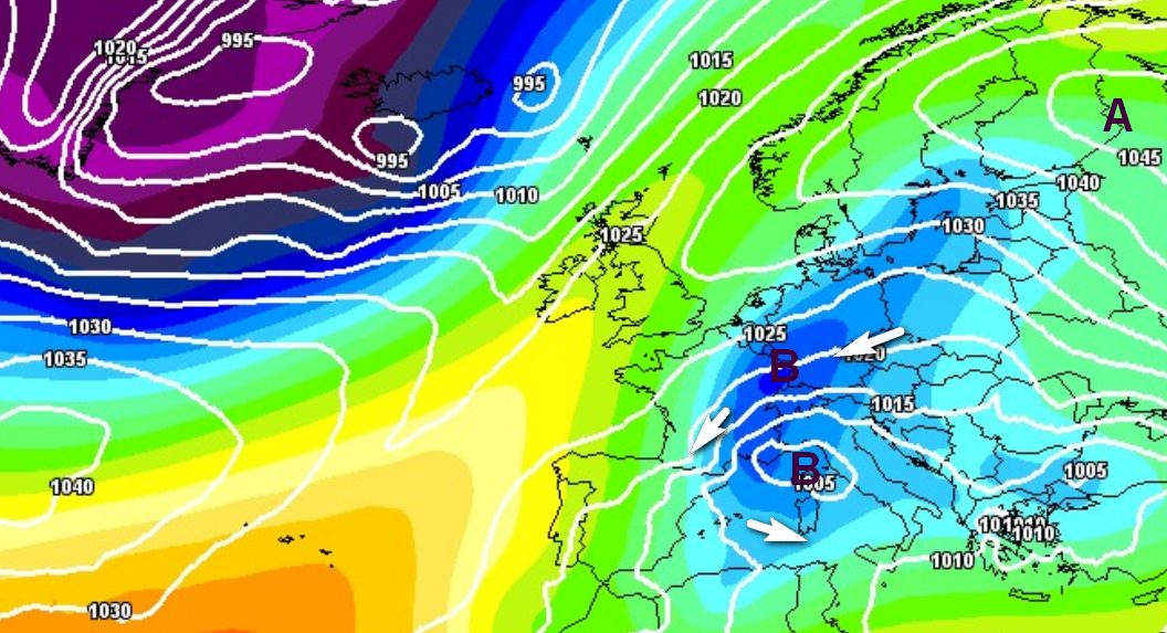 Altra ipotesi (più remota ma non impossibile): aria fredda che scivola sotto un vasto anticiclone centrato sulla Scandinavia e raggiunge l’Italia con moto retrogrado, grande freddo per tutti entro il 12-13 febbraio:
