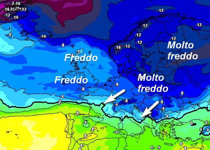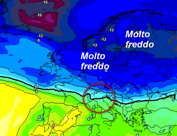 Rispetto a GFS, il modello ECMWF mostra come il freddo più intenso potrebbe restare a nord delle Alpi con effetti davvero marginali sul nostro Paese: appena una 0° alla medesima quota al settentrione ed isoterme invece positive sul resto d’Italia.