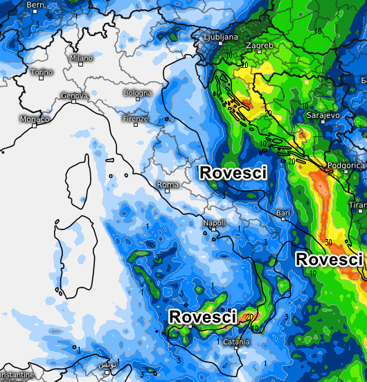 Migliora al nord e su quasi tutto il centro a parte residui rovesci in Abruzzo. Rovesci invece su Sicilia settentrionale, Calabria, Molise e Salento. Ingresso di venti più secchi settentrionali al nord e al centro con parziale calo delle temperature.
