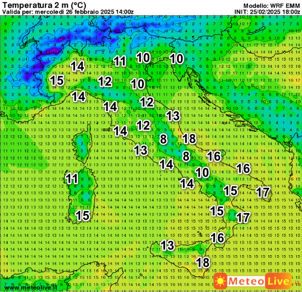 Queste sono le temperature attese in Italia alle ore 15 di mercoledi 26 febbraio:
