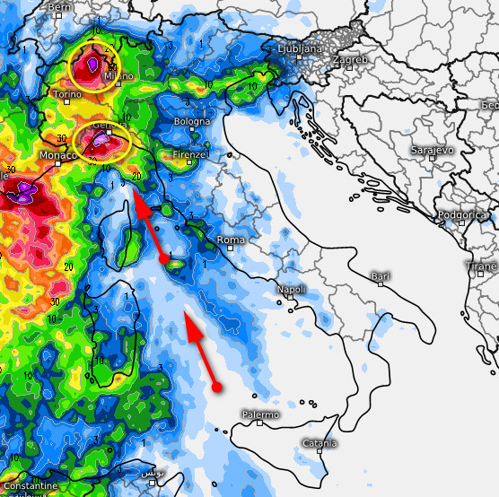 RISCHIO NUBIFRAGI su Liguria centro-occidentale, alto Piemonte e bassa Val d’Aosta. Piogge su quasi tutto il nord ad eccezione dei settori più orientali. Piogge in attenuazione invece sulla Toscana ed in intensificazione sulla Sardegna, ad iniziare da ovest. Scirocco sostenuto ovunque.