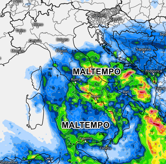 Il maltempo tenderà a concentrarsi su parte del centro e soprattutto sul meridione peninsulare dove saranno possibili temporali e piogge anche intense. Venti forti ovunque in rotazione tra nord e nord-est, temperature in calo anche al meridione sulle Isole. Netto miglioramento del tempo invece al nord con cieli sereni, ed in tendenza sull’alto Tirreno, con schiarite sempre più ampie.