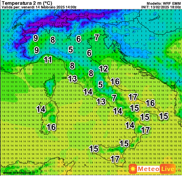 Sul fronte delle temperature, il calo termico dovrebbe intervenire nella seconda parte della giornata e soprattutto in serata. Questi sono i valori massimi previsti in Italia alle ore 15 di venerdi 14 febbraio: