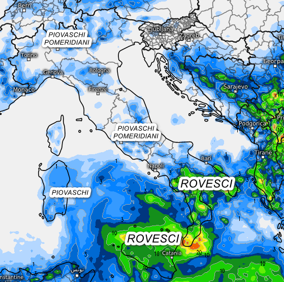 Il MALTEMPO con rovesci e temporali anche forti si concentrerà sulla Sicilia. Rovesci anche in Calabria, sulla Campania fino al basso Lazio. Piovaschi anche sulla Sardegna mentre al nord avremo piovaschi pomeridiani sui rilievi durante le ore pomeridiane.