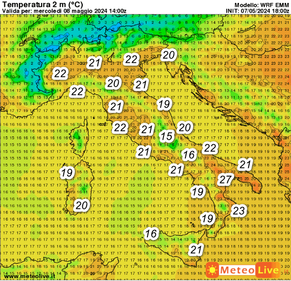 Temperature in aumento al nord, con valori molto gradevoli durante il giorno. Clima gradevole anche al centro e temperature in marcato calo sulla Sicilia e sulla Sardegna. La punta massima sarà circa 27° sulla bassa Lucania.