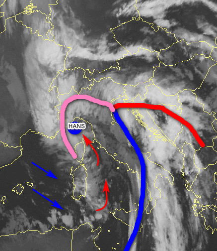 Quello che vedete in foto è un ciclone extratropicale che ha anche un nome: HANS. Come era nelle attese, l’intensa perturbazione che agisce sull’Italia si è svincolata dal flusso atlantico principale e ha dato origine ad un minimo barico chiuso tra la Corsica e il Mar Ligure. A complicare le cose una zona di alta pressione posta ad est che frena il moto della struttura di maltempo verso levante. Vengono cosi prelevati ingenti quantitativi di aria umida dalle basse latitudini del Mediterraneo (frecce rosse) che rappresentano la “pompa di calore” che alimenta questa sorta di “macchina termica”, mentre l’aria fredda che ha raggiunto il Mediterraneo occidentale (frecce blu) rappresenta l’interruttore che innesca i fenomeni temporaleschi ed i rovesci.
