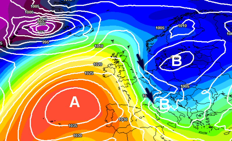 Nei giorni successivi sembrerebbe al momento mancare la frenata giusta della grande corrente occidentale che governa il tempo europeo, quella che consentirebbe l’ingresso di una saccatura in grado di determinare un severo peggioramento, in un simile contesto l’anticiclone seguiterà a fare azione di disturbo limitando l’ingresso dei fronti a veloci sfuriate da nord, come vediamo qui tra lunedì 23 e martedì 24 dicembre:
