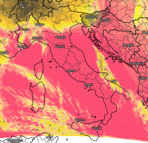 Infine, questo è il soleggiamento totale cumulato previsto tra le 9 e le 16 di sabato 23 novembre (rosa molto soleggiato, giallo nubi e schiarite, grigio scuro assenza di sole):