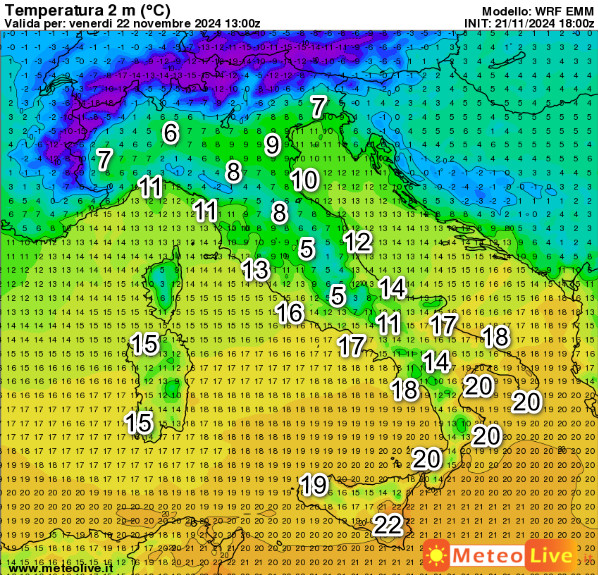 Queste sono le temperature attese in Italia alle ore 14 di oggi pomeriggio, venerdi 22 novembre: