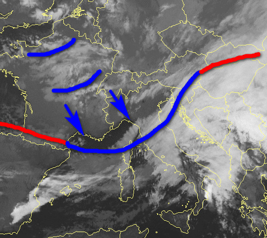 Il sistema frontale si estende con il suo ramo freddo sulle regioni centrali. E’ seguito da aria fredda che tra oggi e domani mattina farà calare le temperature su tutta l’Italia e porterà altri venti di caduta dalle Alpi verso la Valpadana.