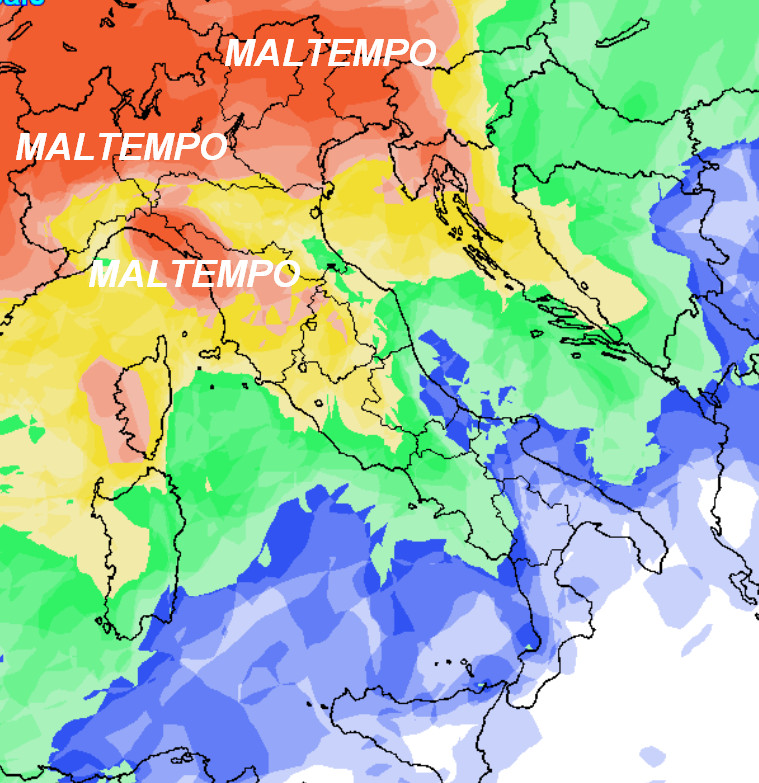 MALTEMPO al nord e su parte delle regioni centrali, specie su Toscana, Umbria occidentale ed alto Lazio. Su queste regioni la probabilità di pioggia viene giudicata ELEVATA o MOLTO ELEVATA. Pioverà anche sul resto del centro ad eccezione dell’Abruzzo e della Sardegna orientale dove la medesima probabilità viene giudicata BASSA. Al sud e sulla Sicilia avremo invece una situazione meteorologica decisamente migliore, con piogge SCARSE se non del tutto NULLE dove vedete il colore bianco sulla cartina.