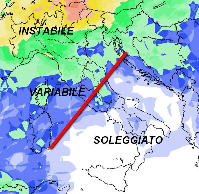 Ad oggi si evincono tre zone di influenza: le regioni settentrionali e la Toscana con tempo un po’ instabile e rischio di brevi rovesci di pioggia principalmente nel pomeriggio e sulle zone montuose; ampie schiarite in Pianura Padana e lungo le coste specie in mattinata.