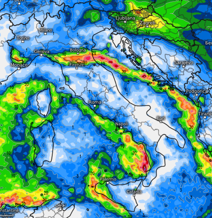 Infine, questa è la sommatoria delle precipitazioni attese in Italia nell’arco della giornata di martedi 10 dicembre: