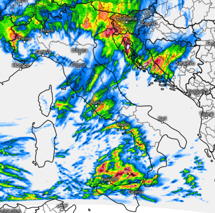 La terza mappa mostra la sommatoria delle precipitazioni attese in Italia nell’arco della giornata di mercoledì 24 settembre: