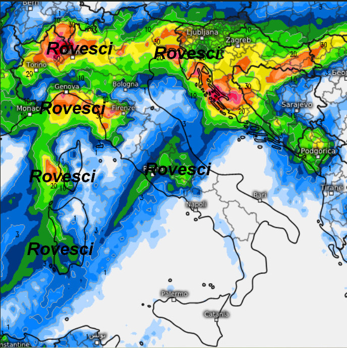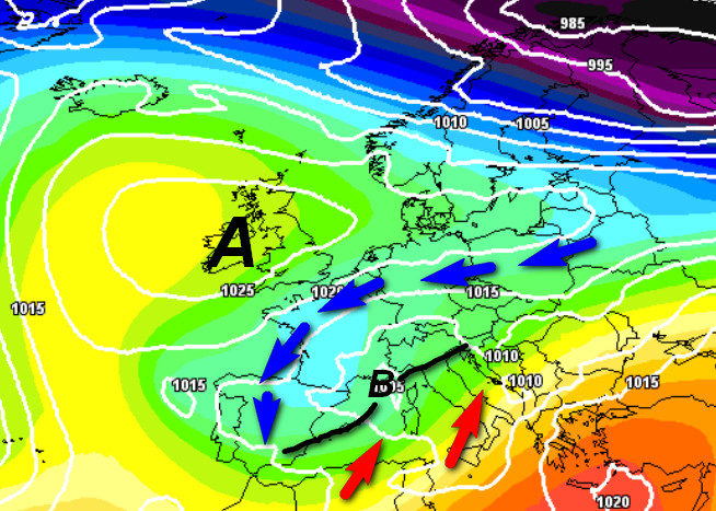 Il perno della depressione sarà ubicato sulla Costa Azzurra. Notate l’aria fredda da nord-est che scorrerà sull’Europa centrale e l’aria mite ed umida sul Mediterraneo e sull’Italia. A separare queste due masse d’aria vi sarà una complessa perturbazione responsabile del maltempo che interesserà il nord e il centro Italia.