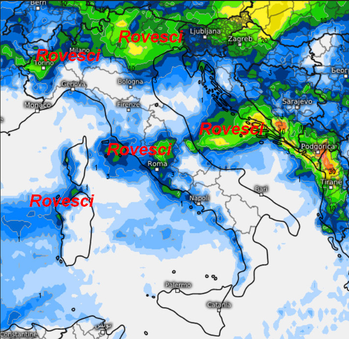 Vediamo infine la sommatoria delle precipitazioni attese in Italia nell’arco della giornata di domenica 16 marzo: