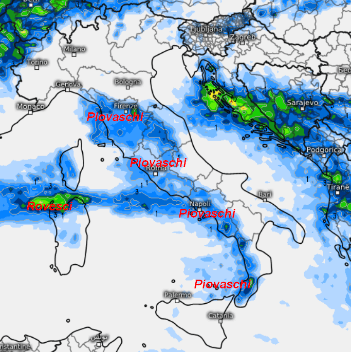 Regioni settentrionali saltate dai fenomeni con tempo spesso soleggiato a parte rovesci sui settori confinali più occidentali. Piovaschi sparsi saranno possibili lungo tutte le regioni tirreniche oltre ai settori interni, dalla Toscana fino alla Calabria occidentale, ma con accumuli generalmente scarsi. Rovesci più consistenti interverranno sulla Sardegna settentrionale, per il resto fenomeni assenti.