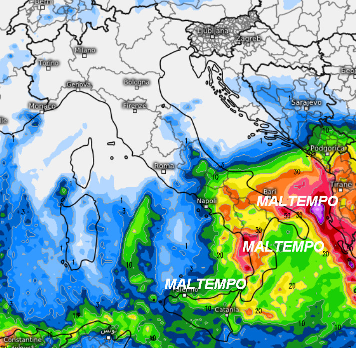 Maltempo al sud con piogge e rovesci intensi specie su Puglia, Lucania e Calabria dove non saranno esclusi nubifragi. Piogge anche sulla Sicilia e piovaschi sulla Sardegna, per il resto tempo asciutto.