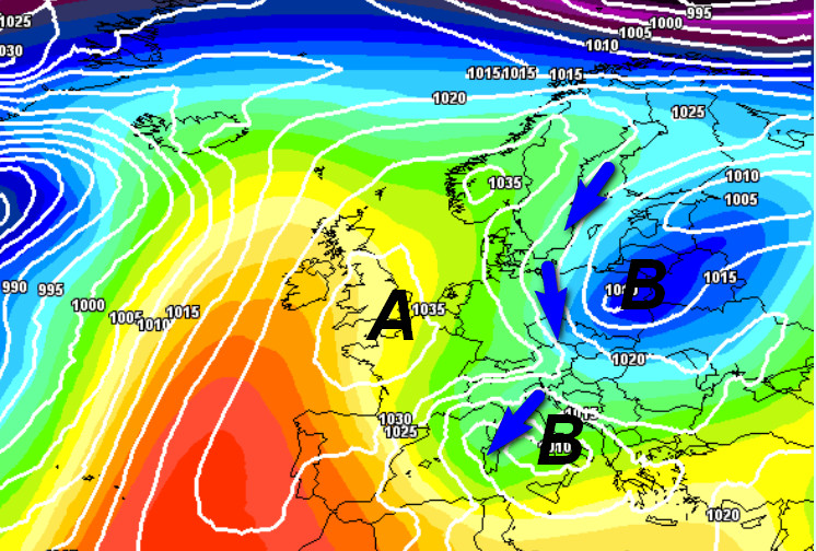 Ecco la rimonta dell’alta pressione che interesserà l’Europa occidentale. Da noi prenderanno piede correnti fredde da nord-est che determineranno un calo delle temperature e condizioni di maltempo su parte del centro e al meridione proprio nel weekend.