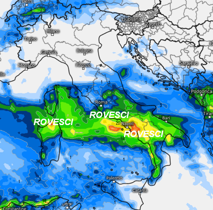 La seconda cartina mostra la sommatoria delle piogge attese in Italia nell’arco della giornata di sabato 11 gennaio: