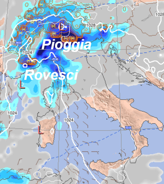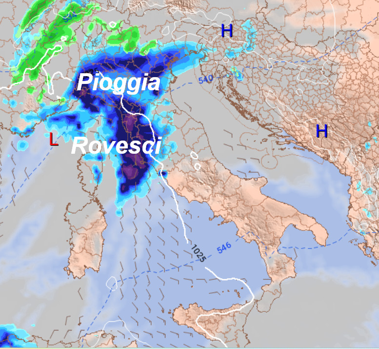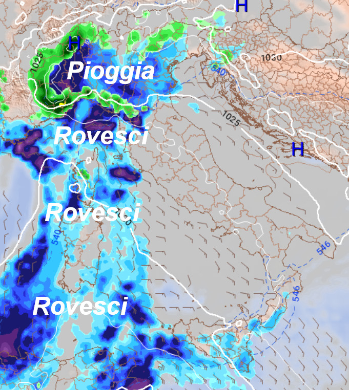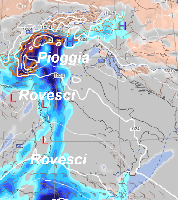 Rispetto a 24 ore fa, il modello GFS ha operato un deciso cambiamento di vedute. Piogge sul nord-ovest e sulla Sardegna con piogge e rovesci; quota neve in calo tra la notte e la mattinata fino a 700-800 metri al nord-ovest, solo localmente a quote più basse. Qualche piovasco anche sulla Sicilia, per il resto tempo asciutto e mite.