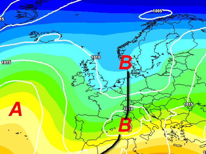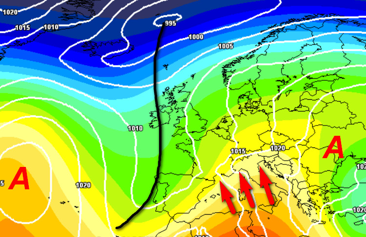 Dalla mappa si evince ciò che abbiamo accennato poco sopra, ovvero la vasta e spigolosa saccatura sull’Europa occidentale fiancheggiata da due zone anticicloniche ai lati. Notate le correnti di Scirocco a testimoniare la fatica di avanzamento della saccatura medesima verso levante.