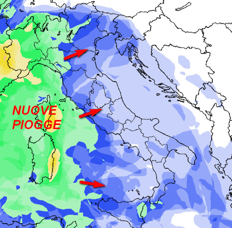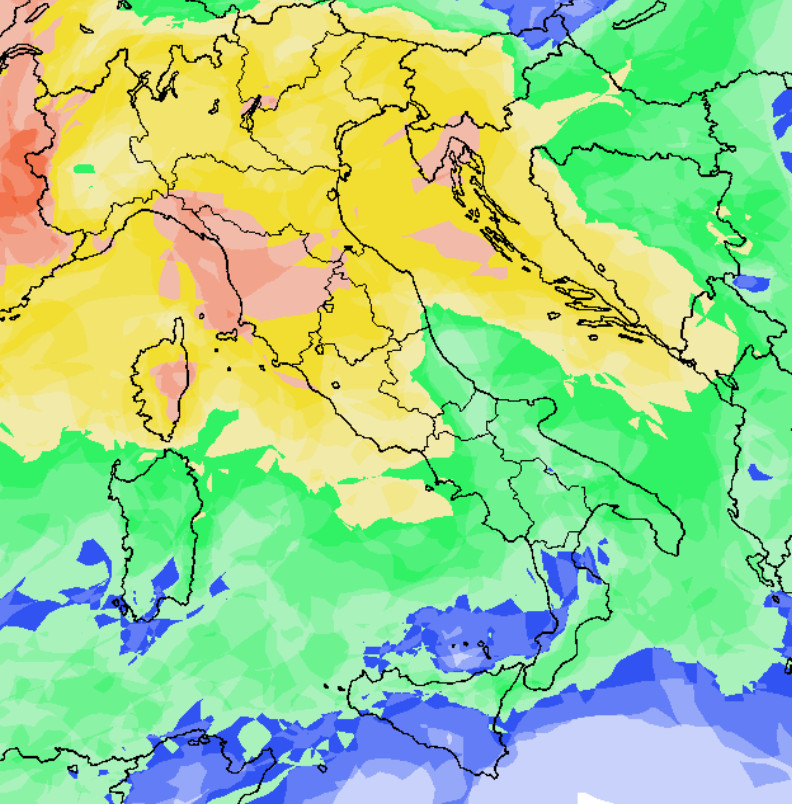 I settori occidentali italiani saranno bagnati da nuove piogge più o meno intense, che si estenderanno verso levante nei giorni seguenti a seguito della lenta avanzata verso est della figura di maltempo. Al meridione e su parte delle regioni centrali le medesime correnti sciroccali saranno artefici di un nuovo e sensibile aumento termico, con valori di molto superiori alla media del periodo.
