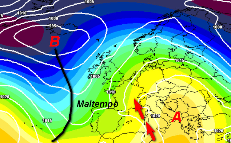 Ancora alta pressione in Italia, ma fortemente insidiata da una saccatura atlantica con annesso sistema frontale in approccio sull’Europa occidentale. I massimi pressori in sede ellenica suggeriscono un richiamo di correnti sciroccali da sud-est che faranno aumentare le temperature al meridione e peggiorare il tempo ad iniziare dai settori occidentali e dalla Sardegna.
