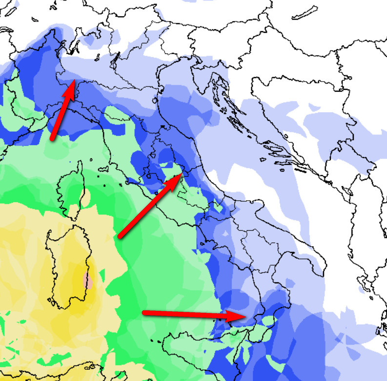 Probabilità di pioggia in aumento ad iniziare dalla Sardegna, ma in estensione al resto della Penisola in accordo con le frecce rosse. Il tempo migliore lo ritroveremo tra il nord-est e il versante orientale della Penisola, dove la probabilità di pioggia si manterrà scarsa o nulla.