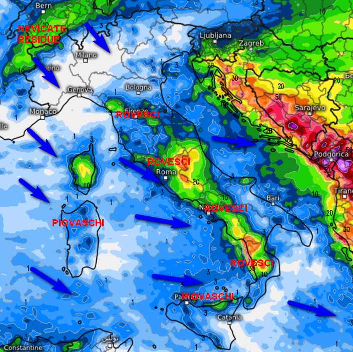Il maltempo interesserà essenzialmente il centro e il meridione. Rovesci anche intensi saranno probabili tra la bassa Toscana, l’Umbria e le zone interne del Lazio, con quota neve in calo fino a 1400-1500 metri. Rovesci intensi anche su Campania e Calabria Tirrenica. Piovaschi su Sardegna e nord Sicilia. In ombra pluviometrica il sud dell’Abruzzo, il Molise, la Puglia e tutto il settore ionico. Attenzione ancora ai venti sostenuti tra ovest e nord-ovest con mareggiate lungo le coste esposte. Vento a raffiche sarà probabile anche sulla Pianura Padana. Temperature in calo ovunque.