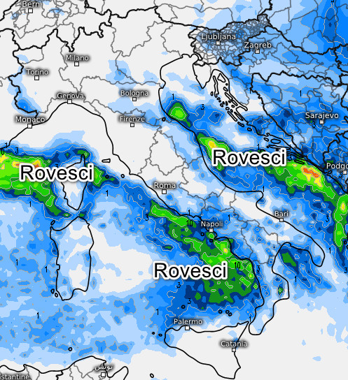 Tempo molto instabile su tutta l’Italia con rischio di acquazzoni specie sull’Emilia Romagna, il medio-basso Tirreno e le Isole. Possibilità anche di temporali. Quota neve sull’Appennino settentrionale tra 600 e 800 metri, 1000 metri su quello centrale. Ancora venti forti a circolazione ciclonica sull’Italia.