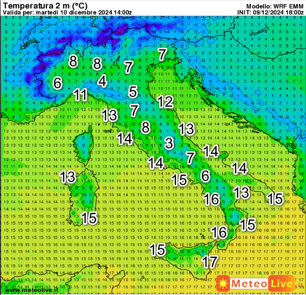 Ancora abbastanza freddo al nord e nelle aree interne dell’Italia centrale con valori quasi ovunque sotto i 10°. Temperature più miti sul resto d’Italia con punte di 17° al sud.