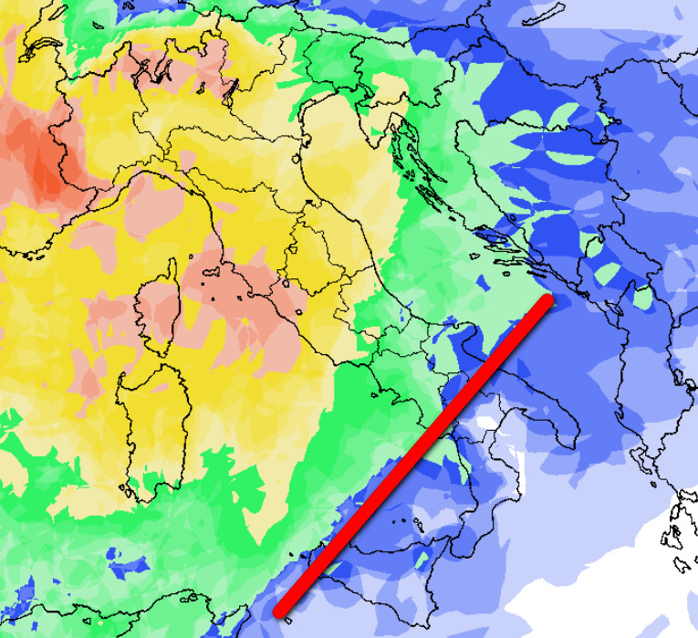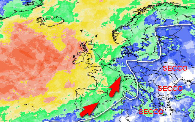 Aria umida (frecce rosse) e possibili piogge invece al nord, sul Tirreno ed in parte anche sulla Sardegna.