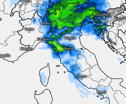 Lunedì 27 nuova perturbazione in arrivo al nord-ovest con piogge e rovesci, limite della neve oltre gli 800-1200m a seconda delle vallate, con fenomeni in estensione nel pomeriggio al nord-est e su parte di Toscana, Corsica e Sardegna, più intensi sul Ponente Ligure: