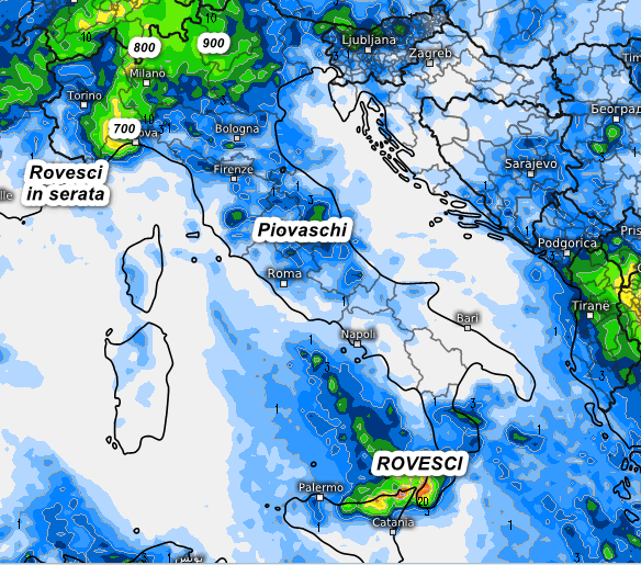 Al mattino ancora rovesci all’estremo sud e sulla Sicilia, in genere soleggiato altrove. In giornata peggiora al nord con rovesci e quota neve in calo in serata sul nord-ovest fino a 700-900 metri. Temperature in lieve aumento ovunque.