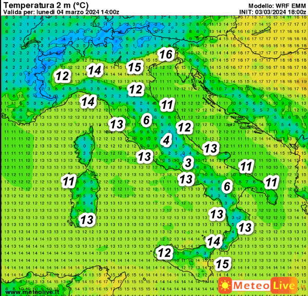 Sul fronte termico, queste sono le temperature attese in Italia alle ore 15 di oggi pomeriggio:
