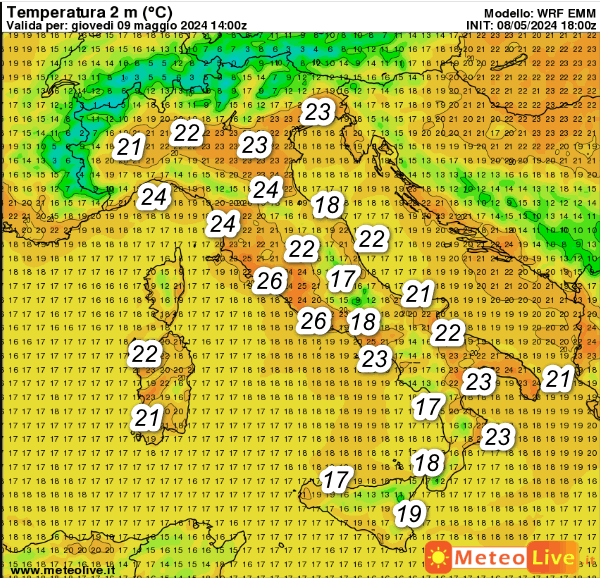 Valori nel complesso gradevoli in Italia, un po’ freschi all’estremo sud per via delle piogge. Punte di 26° saranno possibili sul medio versante tirrenico.