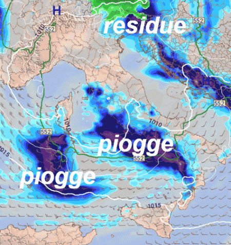 SITUAZIONE: il vortice ciclonico, caratterizzato da aria fredda, che ha tenuto in scacco la Penisola negli ultimi giorni, tende a perdere forza, ma riuscirà ancora per oggi a determinare annuvolamenti irregolari e residue precipitazioni su estremo nord-est, medio-basso Tirreno, Sardegna e zone interne del centro e del sud, come mostra questa mappa delle precipitazioni previste per la mattinata odierna: